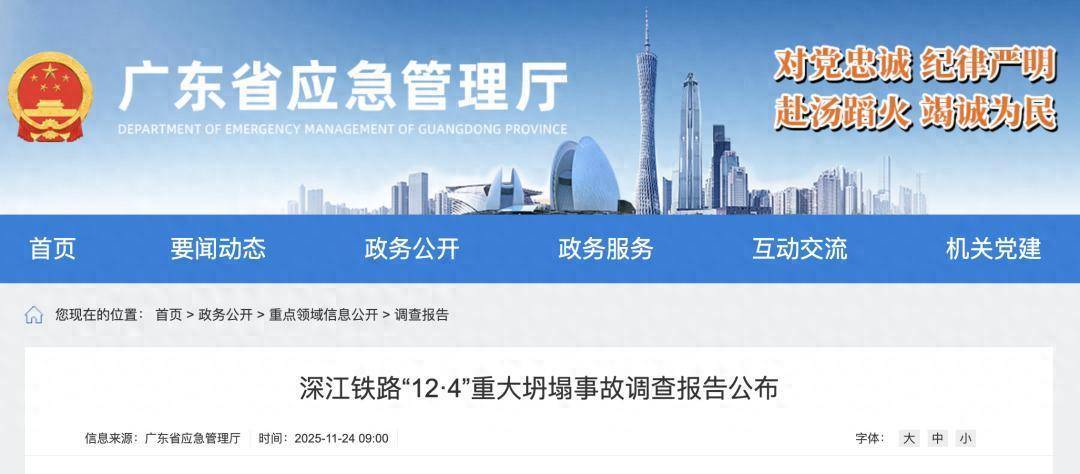 11月24日,广东省应急管理厅发布《深江铁路“12·4”重大坍塌事故调查报告公布》。